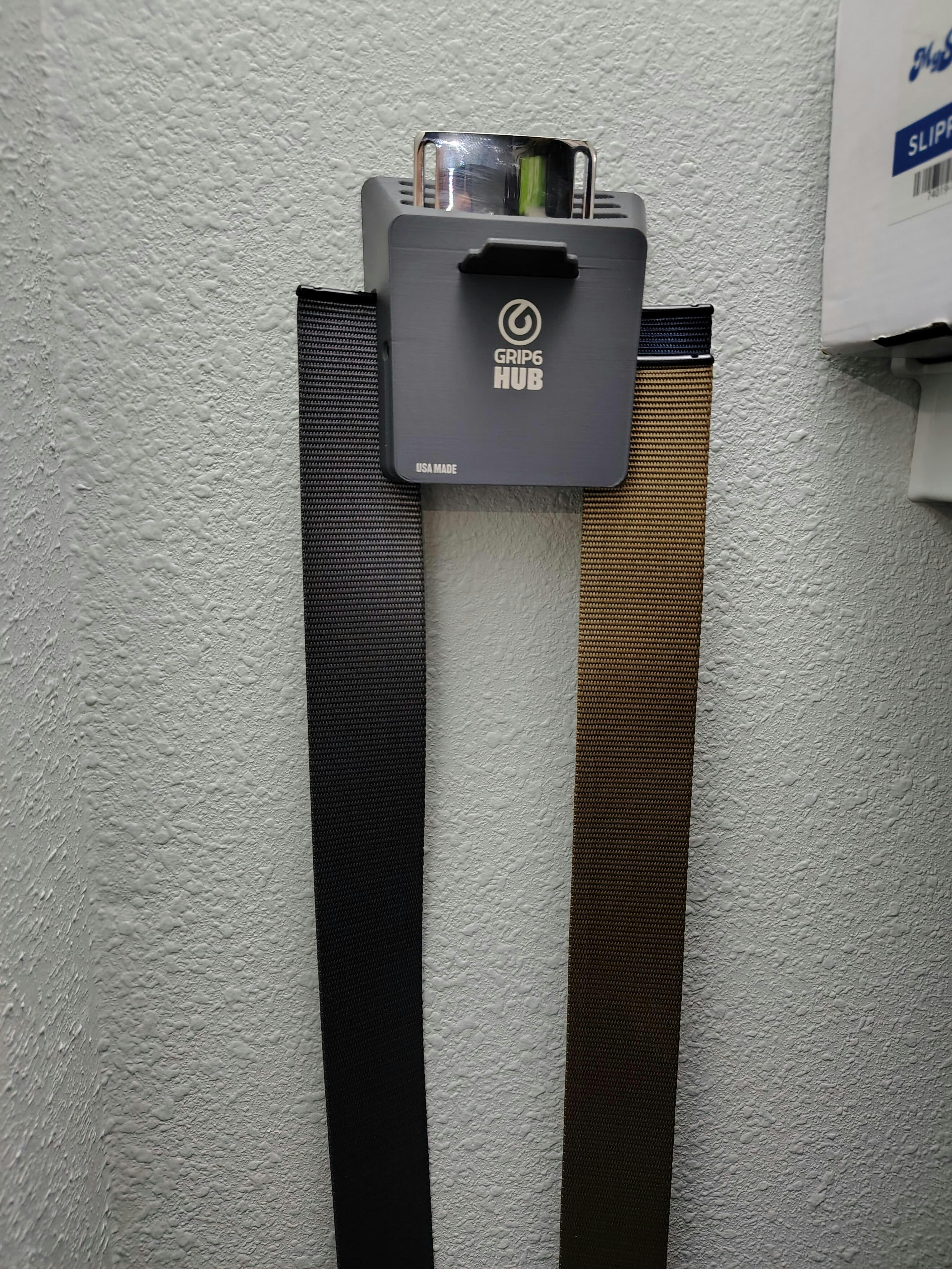 Organize your GRIP6 belts with the all new Hub - wall mount belt organizer. Designed to both organize and display your GRIP6 belt collection, The Hub can hold four buckles and five straps. Easily mount it with simple peel and stick 3M command strips. Constructed with the latest additive manufacturing processes, it's Perfect for those who value both functionality and a tidy space, it's an essential accessory for your belt collection.