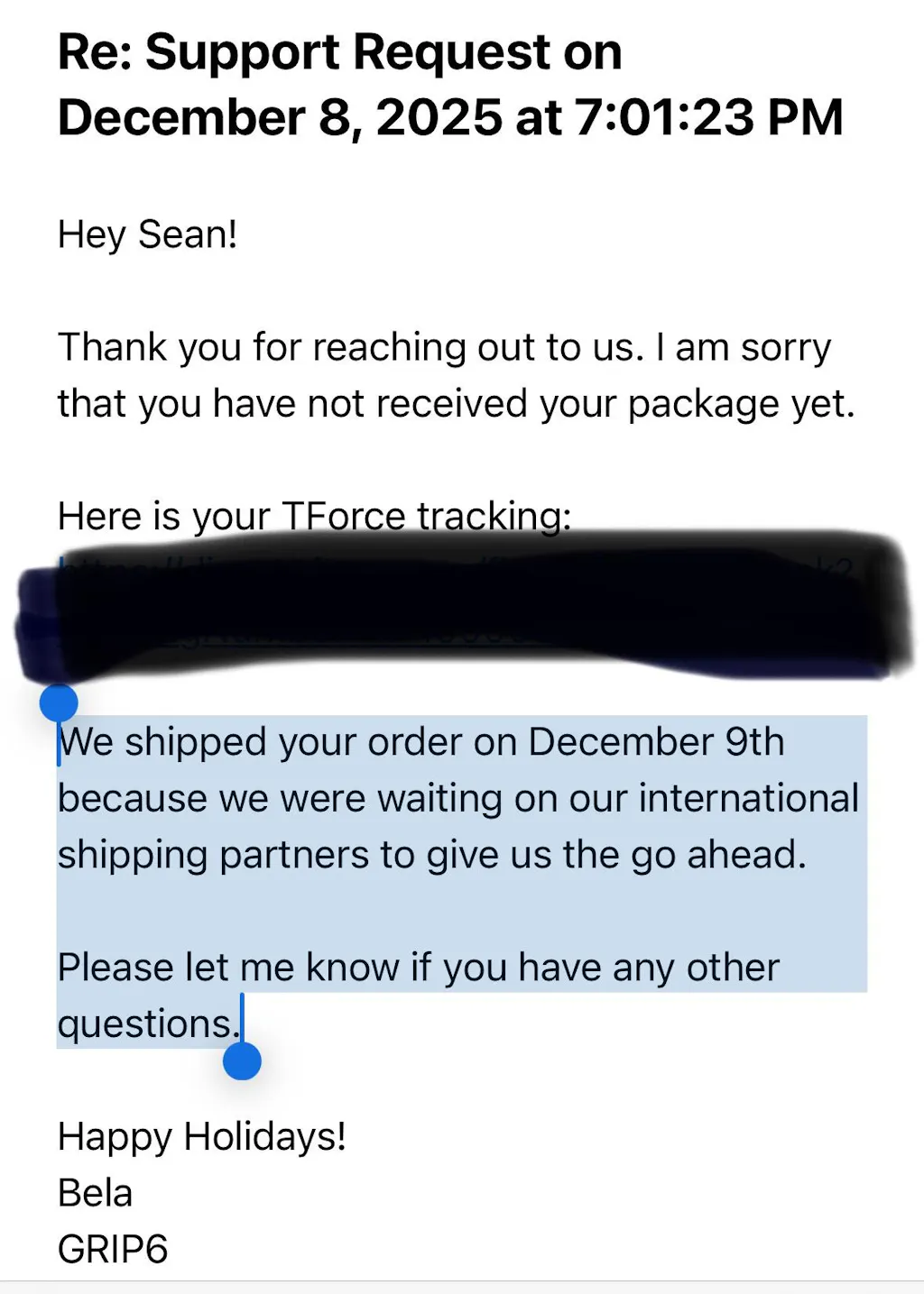 “ We shipped your order on December 9th because we were waiting on our international shipping partners to give us the go ahead.”